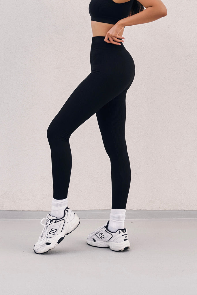 Легінси в рубчик на вісокій посадці, виготовлені із м’якої та еластичної мікрофібри. Тканина повторює рухи тіла, дарує відчуття легкості та комфорту.